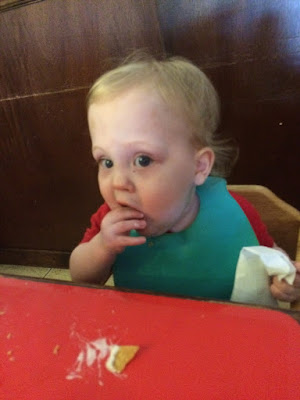 Now Mason is the happiest baby ever! He almost never cries. Sometimes I feel like he gets less attention because he's not as needy! But then I remember that he's Mason and he gets lots of attention! Everyone loves Mason! He's funny! And loud. He has lots of hair, lots of teeth, lots of smiles, and lots of attitude (in a good way though)! I asked the boys' teacher at school which baby is the bad one. It's Mason. He's sneaky. Everyone would probably expect Logan or James. But Mason doesn't nap. And he's loud (I know I said that already but he's that loud) so he keeps the other babies awake. He doesn't cry but he is very opinionated!